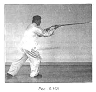 Разверните держащую меч правую руку и поднимите острие меча на уровень лица, так чтобы оно указывало вперед (на восток). Левый цзяньцзюэ расположен за цзяньтан. Слегка поверните корпус влево и подайте его немного вперед. Одновременно сместите вес тела вперед и примите правостороннюю стойку лучника (рис. 6.158).