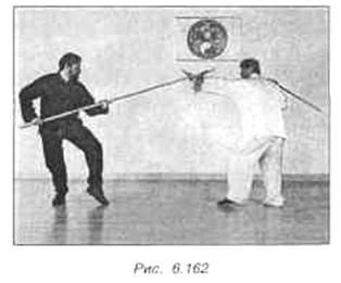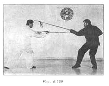 Развернув меч, снизу нанесите противнику удар по выставленной вперед руке нижней стороной лезвия (рис. 6.159). Базовой техникой является шаньцзиэ.