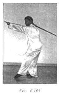Развернитесь на правой пятке против часовой стрелки и сместите вес тела на правую ногу. Продолжайте разворот до тех пор, пока не встанете лицом на юго-запад. Расслабьте правое плечо, опустите локоть и удерживайте меч в правой руке за правым плечом. Цзяньтан должна указывать на юго-запад, а острие меча – по диагонали вниз, на северо-восток. Одновременно расслабьте левое бедро и слегка поднимите левое колено, не отрывая носка от пола. Вы примете правостороннюю несубстанциональную стойку. Направьте цзяньцзюэ назад, на правое плечо, затем на нос (рис. 6.160) и, наконец, устремите его в юго-западном направлении (рис. 6.161).