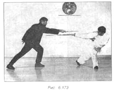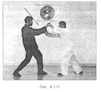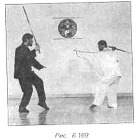 Корпус разворачивается в боевую позицию, а левый цзяньцзюэ блокирует оружие противника (рис. 6.169).