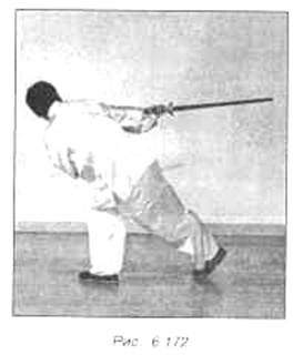 Не останавливаясь, сместите вес тела вперед, на правую ногу. Выпрямите левую ногу и оторвите ее пятку от пола. Подайте корпус вперед. Повернитесь вправо и наклонитесь вперед. Одновременно опустите обе руки вниз и опишите мечом дугу на северо-восток справа, выполняя задний удар. Правая рука должна держать меч хваткой нэйба, а левый цзяньцзюэ – находиться под правым локтем. Поверните голову вслед за движением меча. В конце движения острие меча должно указывать на северо-восток, а сам меч – находиться в горизонтальном положении. Правая рука и клинок должны составлять одну линию (рис. 6.172).