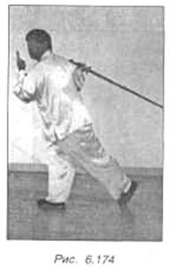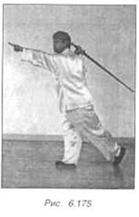 Продолжайте выпрямлять корпус. Правая нога должна быть выпрямлена почти полностью. Вытяните левую руку вперед, направляя цзяньцзюэ на юго-запад. Одновременно поднимайте правую руку с мечом до уровня плеча. Направьте цзяньтан вперед, а острие меча – себе за спину (рис. 6.175).
