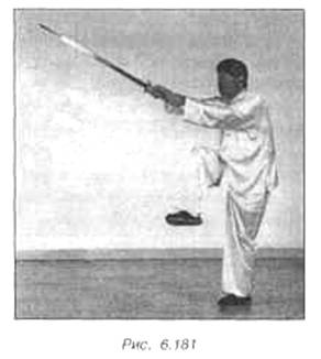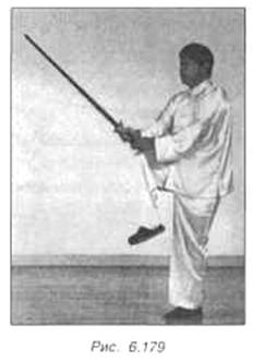 Смените левый цзяньцзюэ на цзяньфа. Удерживая меч обеими руками, подайте его слегка назад и одновременно подайте назад корпус. Острие оружия должно указывать на юго-запад по диагонали. Выпрямите левую ногу и поднимите правое колено на уровень живота, так чтобы оно коснулось цзяньтан. Вы примете стойку на одной ноге (рис. 6.179).