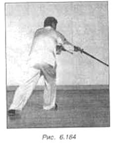 Поверните голову, посмотрите назад и вниз, на северо-восток. Таким образом корпус развернется вправо. Разверните правую стопу вслед за поворотом корпуса и сделайте шаг на северо-восток. Так вы примете правостороннюю стойку лучника. Расслабьте плечи и опустите локти. Обеими руками опустите меч перед собой (рис. 6.183), нанося удар в северо-восточном направлении. Правая рука держит меч хваткой ниба.