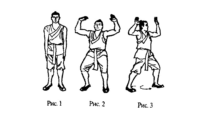 [Закрыть] были друг против друга (рис. 2). Затем руки расходятся в стороны, ладони поворачиваются кверху. Тяжесть тела одновременно пеоенести на правую ногу, а левая нога делает полшага влево.