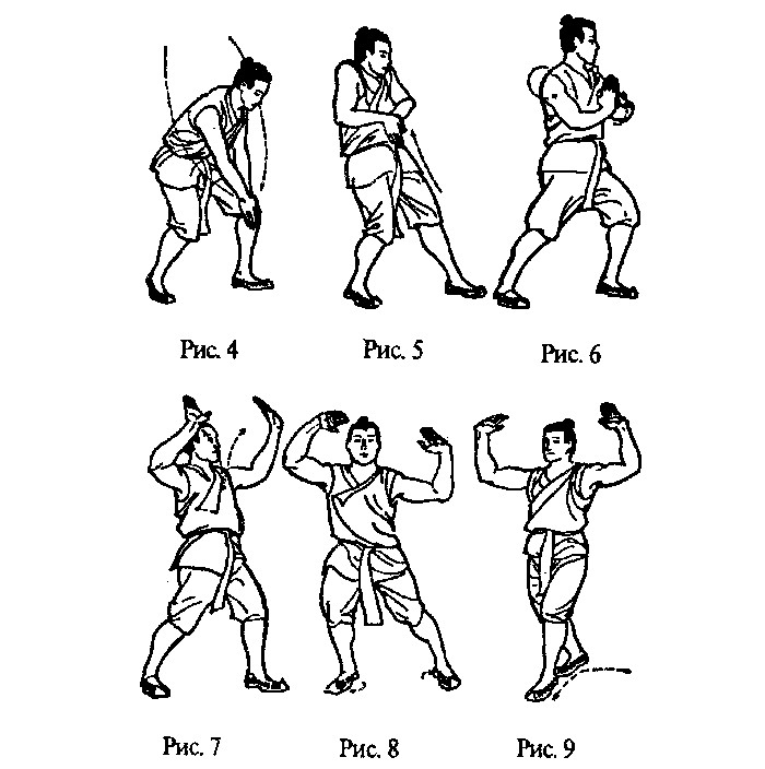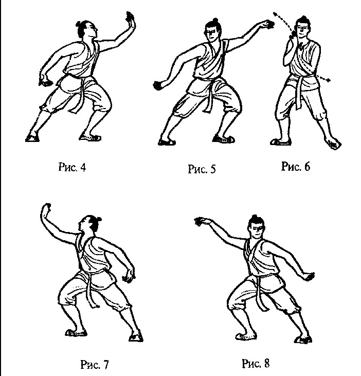 Теперь тело повернуть вправо на 90° (рис. 8). Левую ногу вернуть в исходное положение и тут же сделать шаг вперед-влево. Таким образом левая нога рисует иероглиф „человек" (?)[4]4