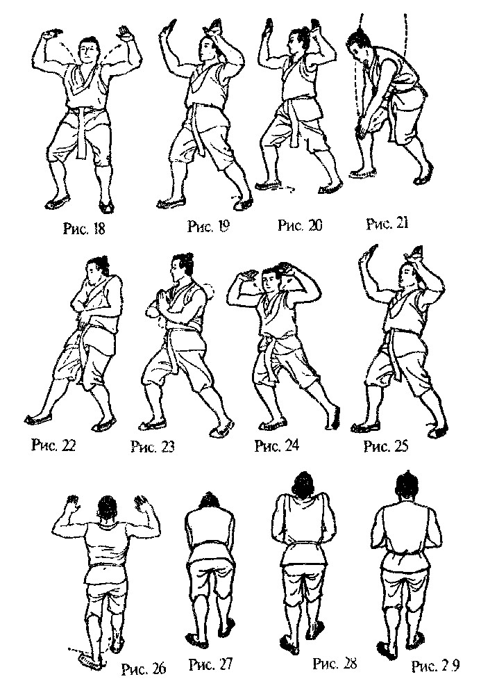 Пятку левой ноги чуть приподнять, ступню повернуть влево на 45°. Тяжесть тела переносится на левую ногу (рис. 25). Правая нога идет назад, а затем на полшага вперед-вправо, рисуя иероглиф „человек" (У). Одновременно туловище поворачивается вправо на 90°. Соответственно левая пятка поворачивается влево на 45 (рис. 26). Руки опустить в стороны-вниз, описывая дугу. Одновременно туловище сгибается и наклоняется вперед. Тяжесть тела переносится на правую ногу (рис. 27). Когда руки дойдут до колена правой ноги, ладони необходимо сомкнуть, руки идут вверх вдоль живота. Туловище выпрямляется, и тяжесть тела переносится на левую ногу (рис. 28). Когда сомкнутые ладони дойдут до груди и плечи опишут круг, повернуть их вверх в жесте приветствия (рис. 29). Затем ладони разомкнуть, руки поднять вверх, развести в стороны, рисуя дугу. Туловище наклонить вперед, тяжесть тела перенести на правую ногу и принять козу кошки в прыжке (рис. 30), Упражнение выполняется в северном направлении.