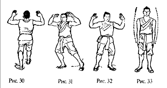 Затем пятку левой ноги чуть приподнять, ступню повернуть влево на 45°. Правая нога идет назад, а затем на шаг вперед влево, рисуя иероглиф „человек" (V)…Одновременно тело поворачивается влево на 90° (рис. 31). Пятка левой ноги поворачивается вправо на 45°. Соответственно туловище поворачивается влево на 90° (рис. 32). Руки опускаются в стороны-вниз и возвращаются в исходное положение (рис. 33).