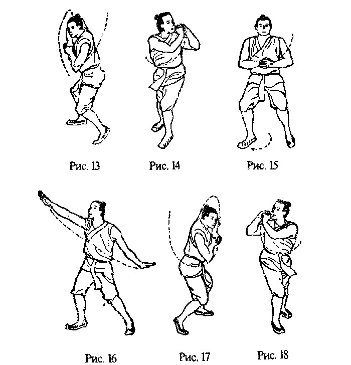 После– этого правая нога делает шаг влево-вперед, описывая дугу, колено сгибается. Тяжесть тела переносится на правую ногу. Правая ступня по отношению к левой образует угол. Одновременно туловище поворачивается, как указано на рис. 15. Кисти размыкаются, и руки разводятся в стороны: правая – вправо-вверх, рисуя дугу, левая – влево-вниз, тоже рисуя дугу. Ладони „смотрят" вниз, впитывая „инь" земли (рис. 16). Затем правая рука возвращается по той же центральной линии в исходное положение, а левая снизу-вверх, описывая дугу через высшую точку над головой, возвращается в исходное положение перед грудью. Здесь она соединяется с правой в традиционном китайском рукопожатии (рис. 17). Тело поворачивается вправо-назад. Лицо также обращено назад. Сомкнутые кисти рук поднимаются до уровня перед правой щекой. Одновременно правая нога сгибается, и на нее переносится тяжесть тела. Ее ступня образует с левой ступней угол. Таким образом принимается поза приветствия (рис. 18). До сих пор упражнение выполнялось с позой приветствия вправо-назад.
