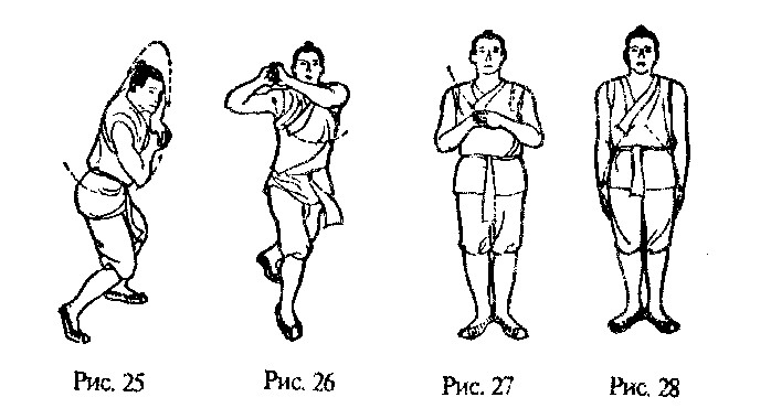 Правая рука вдет вправо-вверх, описывая дугу, и выпрямляется, а левая – влево-вниз, также описывая дугу, и выпрямляется, Ладони рук впитывают земную „инь" (рис. 24). Затем правая рука возвращается по центральной линии в исходное положение, а левая рука снизу-вверх, описывая дугу через высшую точку над головой, возвращается в положение перед грудью. Здесь она соединяется с правой в традиционном китайском рукопожатии (рис. 25). Сомкнутые кисти рук поднимаются до уровня перед правой щекой. Одновременно правая нога сгибается. Ее ступня образует со ступней левой ноги угол.