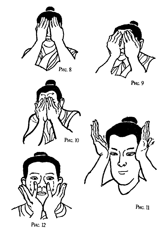 2. Горячие после трения от предыдущего варианта и смыкания ладони осторожно прижимать к глазам 8 раз. Даосы называют эти движения „Прижимание глаз". Затем ладони выгнуть (руки остаются на месте – у глаз), образуя полусферы (рис. 9). Глаза открыть, вращать ими слева направо и справа налево по 8 раз в каждую сторону. Это по-даосски „Вращение глаз". В заключение под ладонями открывать и смыкать веки (8 раз). Это по-даосскк „Смыкание глаз". Все три движения имеют общее название „Три поглаживания глаз".