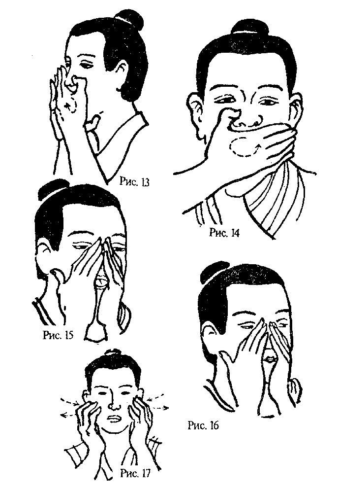 2. Произвести поглаживание той частью ладони, которая примыкает к большому пальцу, от углов глаз к вискам (8 раз). Даосы называют этот вариант. Доглаживанием хвоста феникса".