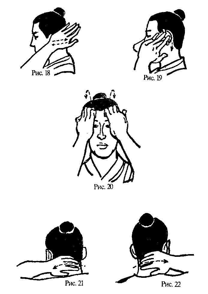 2. Горячими ладонями потереть уши 8 раз – вперед-назад (рис. 18). Обратить внимание на то, что при движении назад следует прикладывать больше силы. Затем средним пальцем свернуть ушные раковины и прижать их к голове, указательные пальцы наложить на средние и трижды помассировать уши движением вниз (рис. 19).