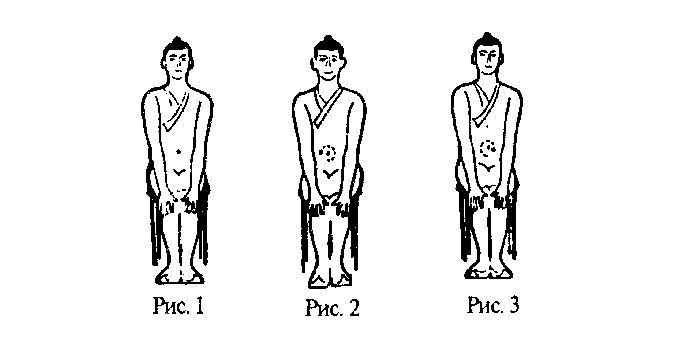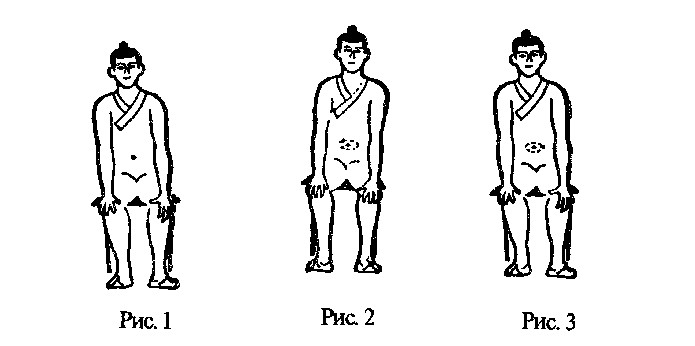 2. Легкие движения мышцами живота и спины с тем, чтобы точка, находящаяся ниже пупка на пол пуня (1,5 см), вращалась вокруг пупка слева направо, рисуя круг диаметром цунь (3 см) (рис. 2). Так 8 раз непрерывно. После этого сделать три глубоких вдоха и выдоха животом (вначале вдох, потом выдох; при вдохе живот выпячивается, при выдохе подбирается). Повторить упражнение еще 8 раз, совершая вращение точки ниже пупка уже справа налево. Посторить дыхательную часть упражнения (рис. 3).