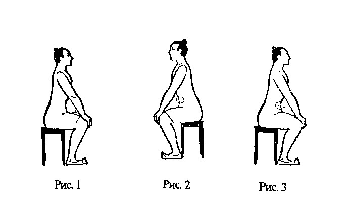 1. Исходное положение. Сесть ровно, прямо, расправить грудь, выпрямить спину, ноги поставить на ширину плеч, пятки чуть оторвать от земли. Руки ладонями вниз положить на колени (рис. 1).