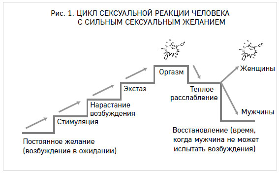 [Закрыть], таких как Пол, оно кипит под поверхностью, готовое откликнуться возбуждением на малейшую стимуляцию. Такому человеку (мужчине или женщине) не нужно трудиться ради возбуждения – у него все происходит легко и быстро. А после стимуляции он шаг за шагом самым предсказуемым образом движется к оргазму. Цикл сексуальной реакции человека с умеренным или высоким уровнем тестостерона показан на рис. 1.