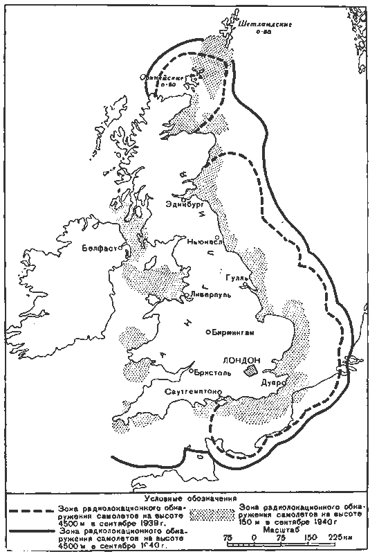 Оккупация немцами Франции и Бельгии выдвинула перед командованием английских ВВС ряд новых проблем. Помимо сильно возросшей угрозы нападения на наши морские конвои и нависшей опасности вторжения немцев на Британские острова, приходилось, учитывать и тот неприятный факт, что самые крупные в мире военно-воздушные силы могли теперь за один час долететь до самой крупной в мире цели*. Кроме того, авиация противника могла легко обойти фланги нашей противовоздушной обороны. Радиолокационное прикрытие вдоль побережья Англии было создано с учетом вероятных налетов авиации противника с аэродромов, расположенных в Германии и Нидерландах. Конечно, такое прикрытие было недостаточным из-за возможности налетов авиации противника с любой точки европейского побережья от Арктики до Пиренеев.