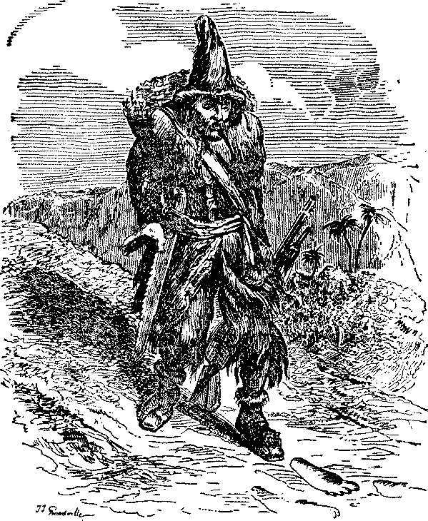 Хотя я твердо решил никогда больше не предпринимать рискованных морских путешествий, но все таки мне очень хотелось иметь лодку под руками для небольших экскурсий. Я часто думал о том, как бы мне перевести ее на мою сторону острова, но, понимая, как трудно осуществить этот план, всякий раз успокаивал себя тем соображением, что мне хорошо та без лодки. Однако, меня почему то сильно тянуло сходить на ту горку, куда я взбирался в последнюю мою экскурсию посмотреть, каковы очертания берегов и каково направление морского течения. Наконец, я не выдержал и решил пойти туда пешком, вдоль берега. Если бы у нас в Англии прохожий встретил человека в таком наряде, как я, он, я уверен, шарахнулся бы от него в испуге или расхохотался бы; да зачастую я и сам невольно улыбался, представляя себе, как бы я в моем одеянии путешествовал по Йоркширу. Разрешите мне сделать набросок моей внешности.