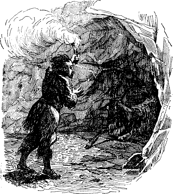 Так вот в один из тех дней, когда я работал в лесу топором, я вдруг заметил за большим кустом небольшое углубление в скале. Меня заинтересовало, куда может вести этот ход; я пролез в него, хоть и с большим трудом, и очутился в пещере высотой в два человеческих роста. Но сознаюсь, что вылез оттуда гораздо скорее, чем залез. И немудрено: всматриваясь в темноту (так как в глубине пещеры было совершенно темно), я увидал два горящих глаза какого то существа – человека или дьявола, не знаю, – они сверкали, как звезды, отражая слабый дневной свет, проникавший в пещеру снаружи и падавший на них.
