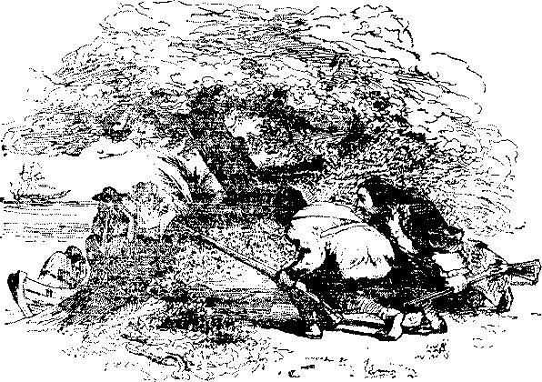 Переправившись через бухточку, они пошли дальше, прихватив с собой еще одного человека. Таким образом, в шлюпке осталось только двое. Я видел, как они отвели ее в самый конец бухточки и привязали там к пеньку.