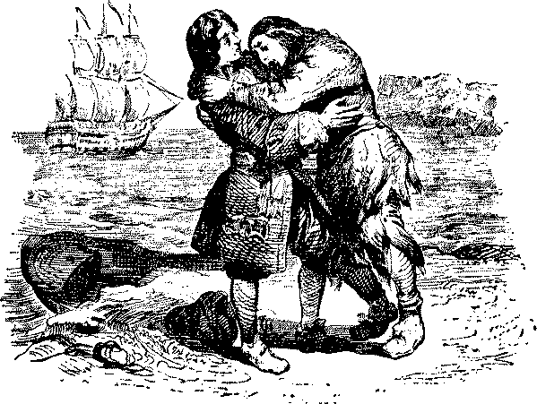 Ясно услышав все семь выстрелов, я лег и, утомленный волнениями этого дня, крепко уснул. Меня разбудил гром нового выстрела. Я мгновенно вскочил и услышал, что кто то зовет меня: «Губернатор! Губернатор!» Я сейчас же узнал голос капитана. Он стоял над моей крепостью, на горе. Я живо поднялся к нему, он заключил меня в свои объятия и, указывая на корабль, промолвил: Мой дорогой друг и избавитель, вот ваш корабль. Он ваш со всем, что на нем, и со всеми нами». Взглянув на море, я действительно увидел корабль, стоявший всего в полумиле от берега. Восстановив себя в правах командира, капитан тотчас же приказал сняться с якоря и. пользуясь легоньким попутным ветерком, подошел к той бухточке, где я когда то причаливал со своими плотами; так как вода стояла высоко, то он на своем катере вошел в бухточку, высадился и прибежал ко мне.