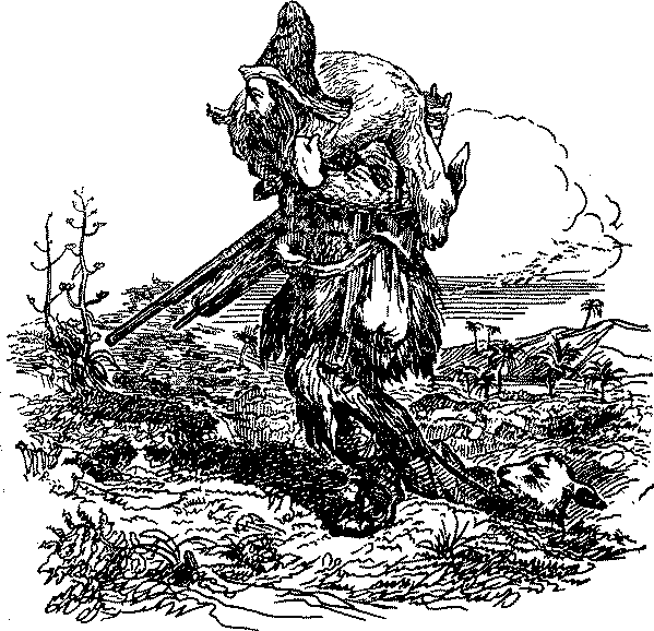 Я уже говорил, что мной сохранялись шкурки всех убитых мною животных (я разумею четвероногих). Каждую шкурку я просушивал на солнце, растянув на шестах. Поэтому по большей части они становились такими жесткими, что едва ли могли на что нибудь пригодиться, но некоторые из них были очень хороши. Первым делом я сшил себе из них большую шапку. Я сделал ее мехом наружу, чтобы лучше предохранить себя от дождя. Шапка так мне удалась, что я решил соорудить себе из такого же материала полный костюм, то-есть куртку и штаны. И куртку и штаны я сделал совершенно свободными, а последние – короткими до колен, ибо и то и другое было мне нужно скорее для защиты от солнца, чем для тепла. Покрой и работа, надо признаться, никуда не годились: плотник я был очень неважный, а портной и подавно. Как бы то ни было, мое изделие отлично мне служило, особенно, когда мне случалось выходить во время дождя: вся вода стекала по длинному меху шапки и куртки, и я оставался совершенно сухим.
