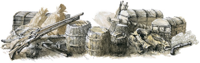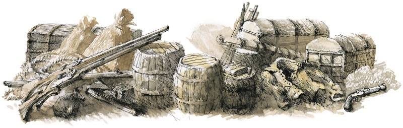 Запасы плотника: два мешка с гвоздями, отвертка, десятка два топоров, точило, стамеска. Три железных лома, два бочонка с ружейными пулями, семь мушкетов и большой мешок с дробью.