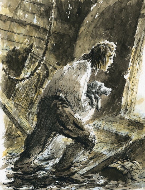 Робинзон вытащил на палубу три матросских сундука, опорожнил их и один за другим спустил на свой плот, покачивавшийся на прибывавшей воде: начинался прилив, и надо было спешить. Он лихорадочно загружал сундуки, спускал на веревках бочонки, когда откуда-то из глубины корабля послышался жалобный лай…