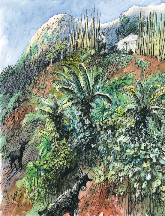 Он постоял несколько минут, чтобы собраться с силами, и двинулся вперед. Ноги увязали в песке, солнце пекло и слепило глаза. Но смятение, поселившееся в душе, заставляло его почти бежать. Наконец, он добрался до первого дерева. Толстое, ветвистое, оно напоминало громадную ель, но только усеянную колючками. Цепляясь за густо растущие ветви, он не без труда, раздирая ладони в кровь, дополз почти до верхушки. И обомлел.