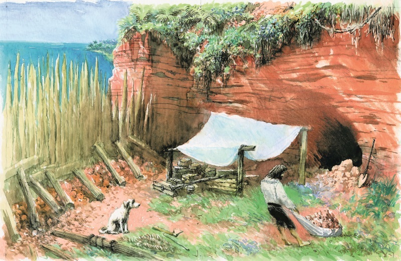 Собаку Робинзон оставлял на берегу охранять свое богатство, ибо немного опасался, что в его отсутствие какие-нибудь звери уничтожат съестные припасы. Впрочем, возвращаясь на берег, он не замечал никаких следов непрошеных гостей. Однако мог пойти дождь, и подмочить не только сухари, но и, что еще опаснее, порох. И Робинзон стал устраивать укрытие.