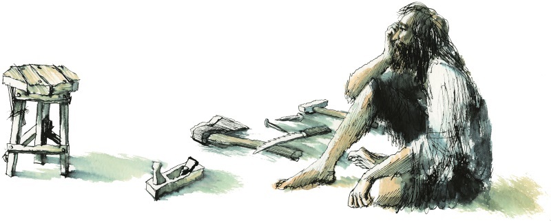 Первым делом он принялся мастерить стул, вернее, трехногую табуретку. Это представлялось ему самым легким. Но все оказалось не так-то просто. Прошла неделя прежде, чем изделие приняло более или менее знакомую форму и надежную устойчивость. Но, почувствовав уверенность, Робинзон теперь принялся за стол. Потом соорудил и полки.
