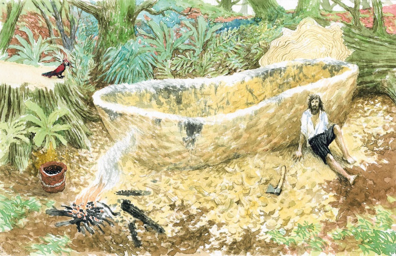 Предстояло найти подходящее дерево. Робинзон обошел с топором окрестности и в конце концов отыскал нужное ему. Это был огромнейший, может, и столетний, кедр. Много дней ушло прежде, чем Робинзон свалил дерево. Очистив его от ветвей, он отделил от ствола самую толстую часть длиной метра три. На это ушел месяц. Теперь предстояло придать колоде форму лодки и выдолбить ее внутри. Выжигать огнем, как это делают иногда туземцы, он не решился – можно сжечь будущую лодку дотла. Не сидеть же над ней дни и ночи напролет! Пришлось орудовать сначала топором, а потом молотком и стамеской. Три месяца день за днем Робинзон приходил к своей лодке и долбил, долбил. И вот перед ним лежала на земле чудесная пирога. Она смело могла поднять человек двадцать пять, а значит, и весь груз, который понадобится в долгом плавании.
