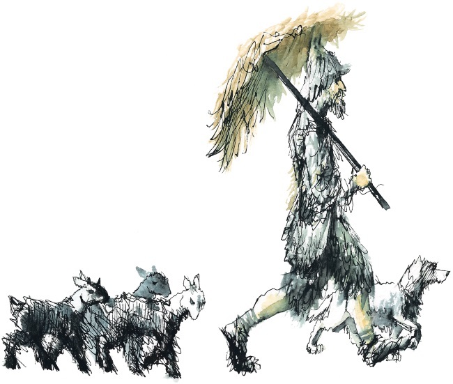 Надо было видеть эту забавную картину. Впереди шел странно одетый длинноволосый человек. На голове у него была напялена высокая остроконечная шапка из козьего меха. Камзол и короткие штаны, сшитые из шкуры длинношерстого козла, блестели на солнце. А над головой этот человек держал огромный зонтик, обтянутый тоже козлиной шкурой мехом наружу, чтобы при сильном дожде потоки воды не застаивались, а тут же стекали вниз. Спасал зонтик и от нещадно палившего солнца. И вот за этим на первый взгляд забавным чучелом доверчиво семенили блеющие белые и пестрые козлята с едва пробивающимися упрямыми рожками. У ног этого широко шагавшего человека вилась и чуть постаревшая собака. Она, конечно, считала себя его главным другом. И была права.