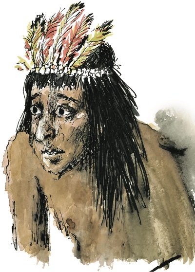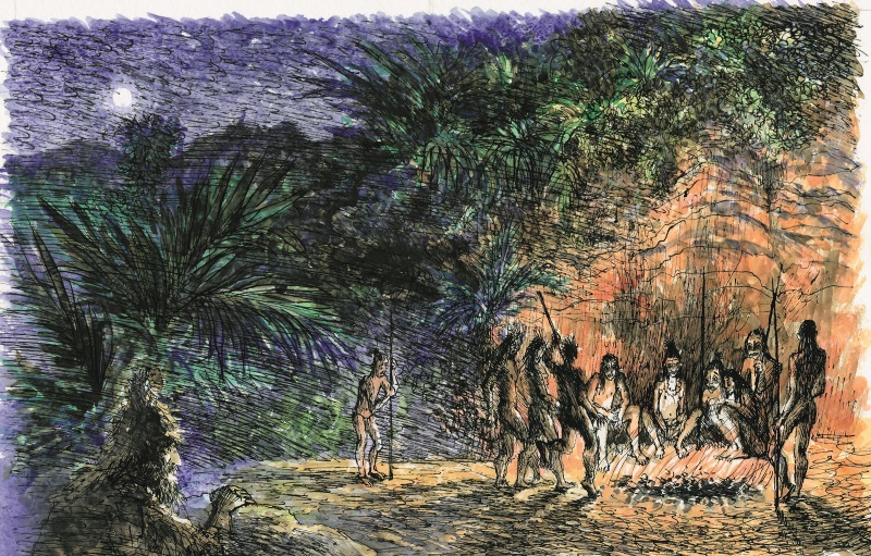 Так рассуждая, Робинзон медленно двигался к бухте, куда ноги сами несли его. Но инстинктивная осторожность заставила спрятаться за скалами. И вовремя! Послышались громкие всплески весел и гортанные выкрики. Робинзон быстро вскарабкался на нависшую над берегом пологую скалу. Здесь он был невидим с берега, а сам мог наблюдать за приплывшими сюда дикарями. Их было человек десять. Все голые, лишь с повязками вокруг бедер. Они вытянули узкие долбленые из цельного ствола дерева пироги на песок и принялись разводить костер. Конечно, не для того, чтобы погреться. День был в разгаре, и стояла страшная жара. Как только огонь запылал, дикари сели вокруг костра в кружок. Раскачиваясь, они завели заунывную песню, которую тянули на одной тоскливой ноте. Так продолжалось довольно долго. Робинзон хотел уже отползти в сторону и потихоньку исчезнуть.
