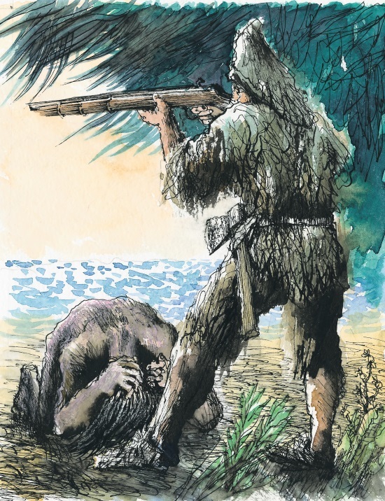 Дикари у костра вскочили и уставились в небо, не понимая, откуда гремел гром. Робинзон понял, что опешивший дикарь вот-вот придет в себя и пустится наутек. Стоит ему указать на увиденное им странное существо в меховой одежде, и вся кровожадная толпа кинется на него. Раздался еще один выстрел, и второй дикарь упал на песок, раскинув руки.