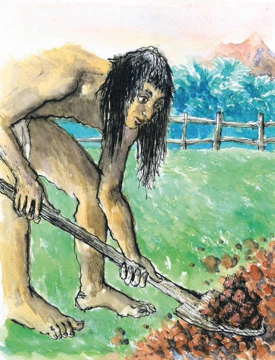 Вдруг Робинзон остановился. Он вспомнил, что убитые дикари остались лежать на песке. Решительно повернувшись, он двинулся назад. Нехорошо оставлять тела не похороненными. Лопаты у него с собой не было. Робинзон подобрал какой-то сук и принялся ковырять сырой песок. Его новый слуга оказался смышленым. Он упал на колени и, быстро-быстро работая широкими ладонями, как лопатами, выкопал достаточно глубокую яму. Так же ловко он стащил туда тела убитых и забросал их песком.