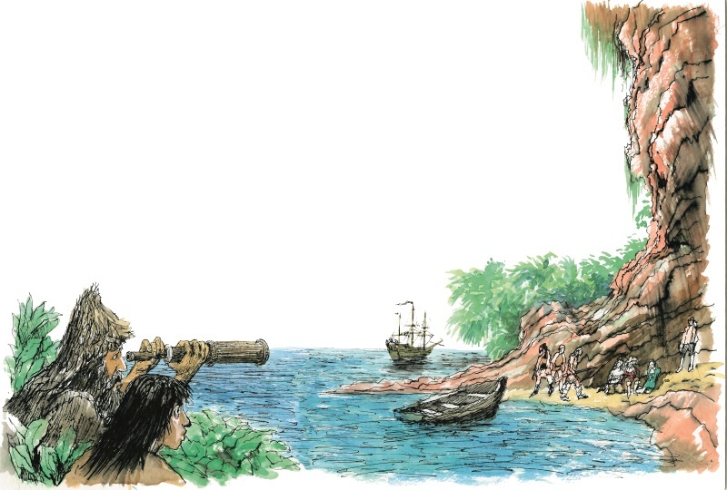 Вдалеке, в утреннем тумане маячили паруса большого корабля, стоявшего на рейде. А ближе к берегу в лучах восходящего солнца плыл баркас. Да, да, настоящий корабельный баркас! Поблескивали вырываемые из воды влажные весла. Высокий нос легко резал воду. Робинзон приставил подзорную трубу к глазам. Теперь ясно было видно, что в лодке примерно дюжина матросов. В другое время Робинзон выскочил бы из своего укрытия и кинулся к берегу, размахивая руками. Но жизнь на острове давно приучила его к осторожности.