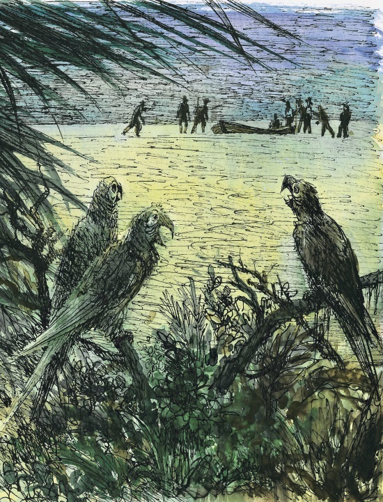 Однако не все было так просто. Но сначала все складывалось неплохо. Подойдя к берегу, посланцы с корабля вышли из шлюпки и вытащили ее на берег. Это порадовало Робинзона. Он боялся, что осторожные разбойники, не доходя до берега, поставят шлюпку на якорь. Тогда при первой тревоге они снимутся с якоря и вернутся на корабль, всполошив всю взбунтовавшуюся команду.