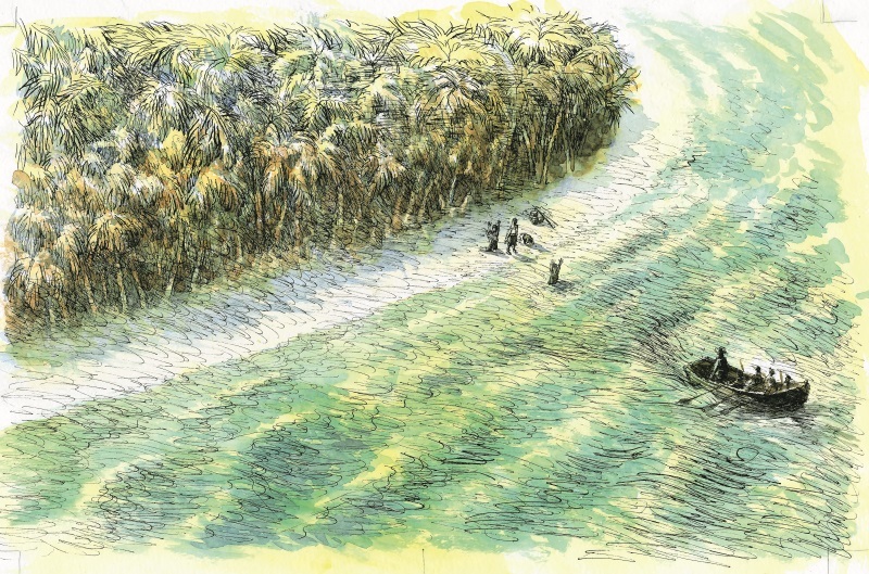 Капитан выполнил свое обещание и, сверившись по карте, нашел остров, где жило племя Пятницы. Он был достаточно большой, но на карте выглядел крохотным пятнышком. Пятница никак не мог поверить, что так выглядит на бумаге белых людей его просторная, раздольная родина, где необозримые леса и зеленые луга, высятся горы и свергаются с них бурные реки, где столько дичи для охоты и живет большое племя его родичей.