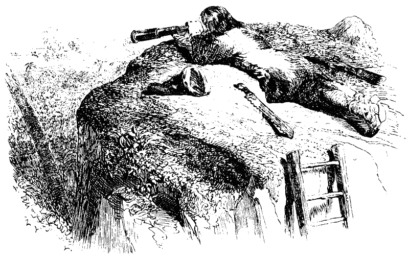 Что делается в лагере врага, я не знал. Эта неизвестность томила меня. Я схватил подзорную трубу, приставил лестницу к покатому склону горы и добрался до вершины. Там я лёг ничком и направил трубу на то место, где видел огонь. Дикари, их было девять человек, сидели вокруг небольшого костра, совершенно нагие.