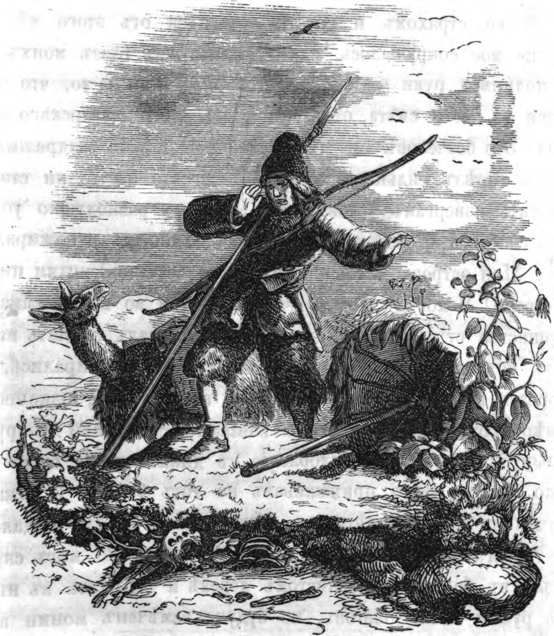 Если я куда-нибудь отправлялся въ дальній путь, то костюмъ мой былъ слѣдующій. Я опоясывался кушакомъ, на одной сторонѣ котораго былъ заткутъ топоръ, а на другомъ – пила; чрезъ плечо подъ лѣвою рукой висѣлъ на ремнѣ двойной мѣшокъ съ порохомъ и дробью, на спинѣ былъ коробъ съ съѣстными припасами и разными другми вещами; на плечѣ висѣло ружье, а голова въ козлиной мохнатой шапкѣ прикрыта была зонтикомъ отъ дождей. и яшры.