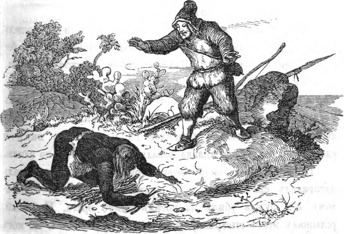 Второй дикій, видя своего товарища убитымъ, сталъ натягивалъ свой лукъ; но я предупредилъ его и выстрѣломъ изъ ружья убилъ на повалъ своего врага. Плѣнный, услышавъ этотъ выстрѣлъ, оцѣпенѣлъ отъ страха и не могъ болѣе сдѣлать ни одного шага. Я махалъ ему дружелюбно рукою и разными знаками приглашалъ его подойти ко мнѣ; но онъ не довѣряясь, то приближался ко мнѣ на нѣсколько шаговъ, то опять удалялся, вѣроятно боясь сдѣлаться вторично плѣнникомъ и быть убитымъ подобно двумъ его непріятелямъ. Наконецъ, когда я ему сдѣлалъ третій знакъ съ самымъ ласковымъ выраженіемъ лица, то онъ нѣсколько ободрился и началъ тихо подходить ко мнѣ, падая чрезъ каждые 10 или 12 шаговъ на колѣни, чтобы показать тѣмъ свою покорность. Когда я подошелъ къ нему, онъ упалъ на землю, цѣловалъ ее и, взявъ мою ногу, положилъ ее себѣ на голову, чтобы выразить тѣмъ свою преданность, и что онъ желаетъ быть моимъ рабомъ. Я поднялъ его и старался ласками успокоить его. Въ это время я замѣтилъ, что дикій, котораго я положилъ на землю ударомъ приклада, былъ еще живъ и старался подняться съ земли. Я показалъ это своему плѣннику. Онъ отъ страха произнесъ нѣсколько словъ, которыхъ я хотя не понималъ, но которыя доставили мнѣ несказанное удовольствіе, потому что я не слыхалъ человѣческаго голоса уже 25 лѣтъ. Потомъ онъ указалъ мнѣ на мою саблю и знаками просилъ, чтобъ я отдалъ ее ему. Я исполнилъ его желаніе. Тогда онъ въ одно мгновеніе подбѣжалъ къ своему врагу и однимъ ударомъ сабли отрубилъ ему голову. Послѣ этого онъ возвратился ко мнѣ, смѣясь и прыгая, чтобъ тѣмъ выразить свое торжество, и съ разными жестами, значеніе которыхъ я не понималъ, положилъ къ ногамъ моимъ саблю и отрубленную голову дикаго.