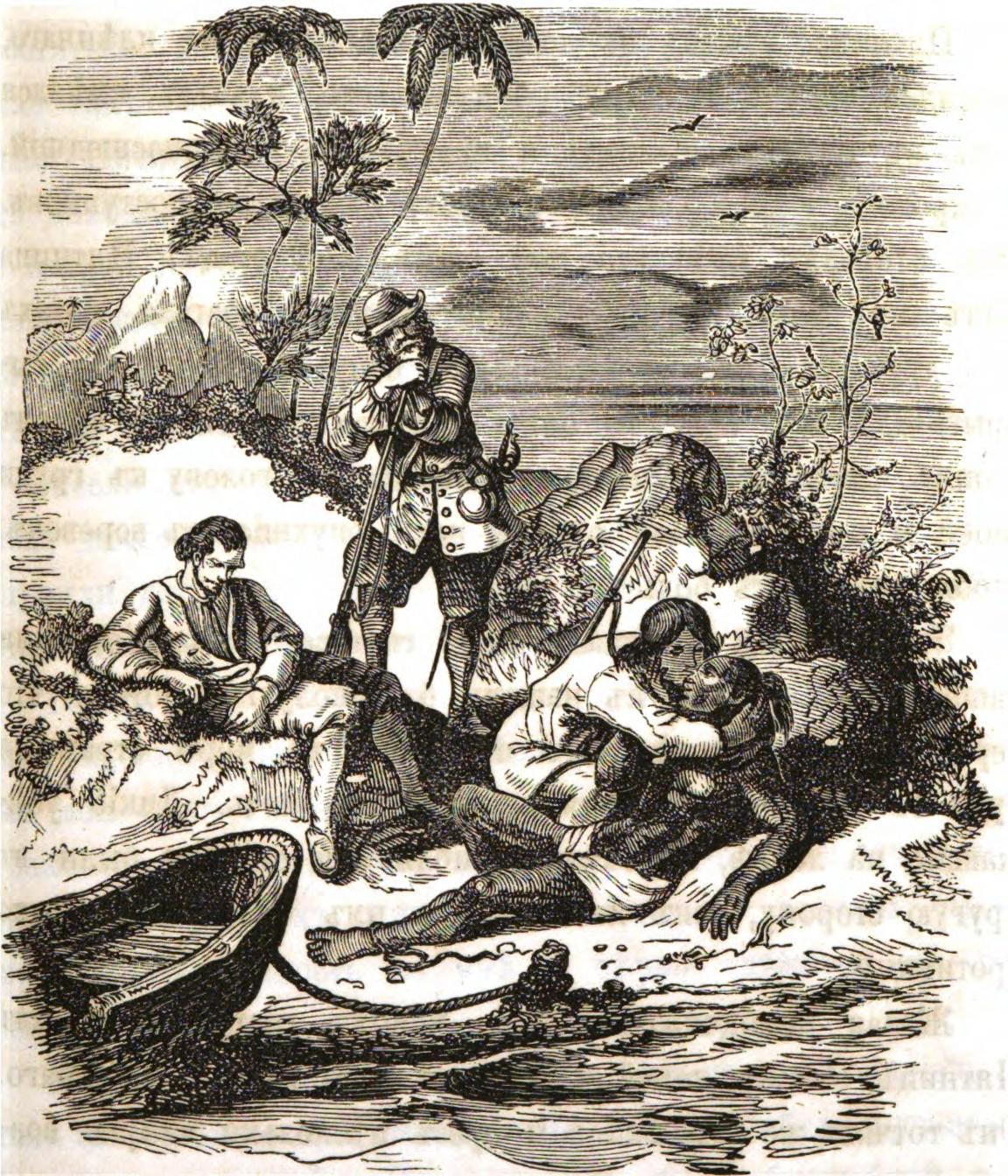 Этотъ случай помѣшалъ намъ гнаться за непріятелями нашими, что и было къ нашему благополучію, потому что черезъ полчаса послѣ этого поднялась на морѣ страшная буря съ вихремъ продолжавшаяся всю ночь. Дикіе убѣжавшіе на лодкѣ, вѣроятно погибли или снесены были въ другую сторону, такъ какъ вѣтеръ имъ былъ совершенно противный.