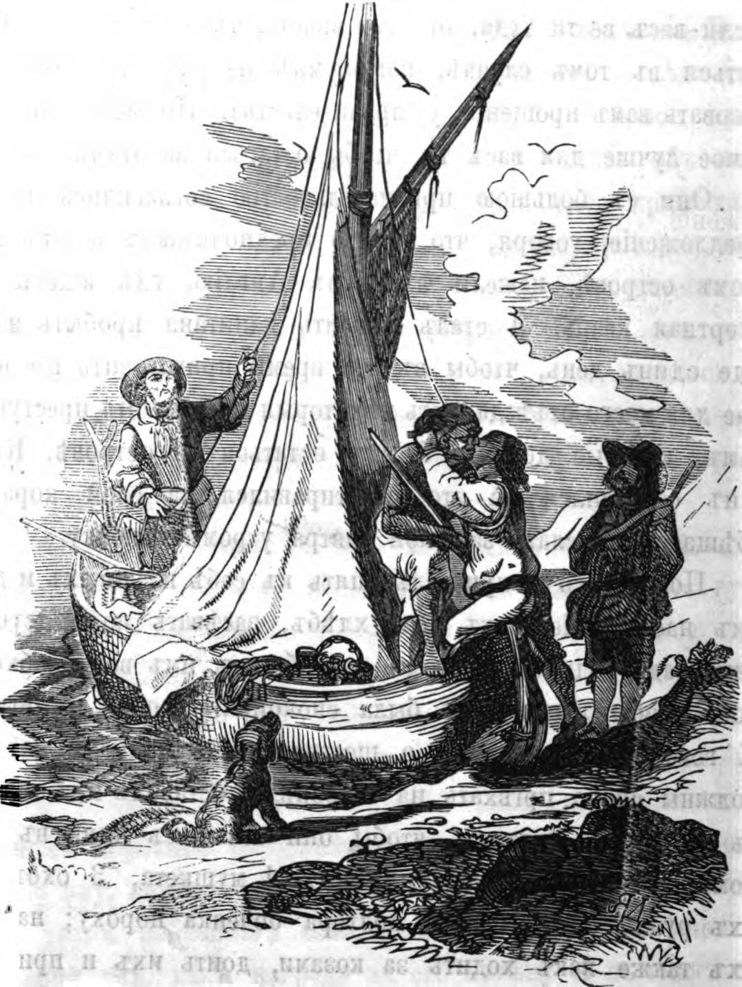 Мнѣ хотѣлось, во что бы ни стало, спасти этихъ трехъ несчастныхъ. Въ то время, тогда матросы бродили по острову, я замѣтилъ, что плѣнные были свободны идти, куда хотятъ; но они не смѣли этого сдѣлать и сидѣли на землѣ, задумчивые и печальные. Англичане прибыли на островъ во время прилива, теперь же начался отливъ, а потому шлюпка ихъ осталась на сушѣ. Хотя въ ней и находились два матроса, но они были пьяны и спали. Одинъ изъ нихъ проснулся и видя, что шлюпка глубко вошла въ песокъ, сталъ кричать, призывая къ себѣ другихъ; но однако же всѣ они не могли вытащить ее, потому что она была очень тяжела. Видя такое затрудненіе, они, какъ настоящіе моряки, т. е. люди самые беззаботные въ свѣтѣ, перестали думать о шлюпкѣ и опять ушли въ лѣсъ.