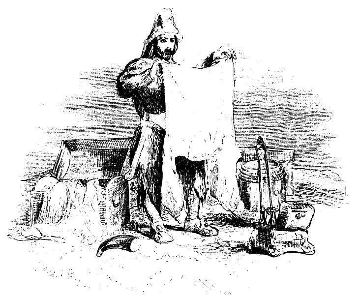 Прежде всего я надел на него штаны. В одном из сундуков, взятых мною с погибшего корабля, нашлась готовая пара холщовых штанов; их пришлось только слегка переделать. Затем я сшил ему куртку из козьего меха, приложив все своё умение, чтобы куртка вышла получше (я был в то время уже довольно искусным портным), и смастерил для него шапку из заячьих шкурок, очень удобную и довольно красивую.