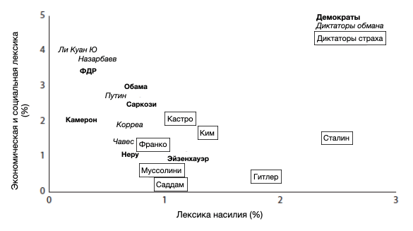 Мы проанализировали речи диктаторов страха и диктаторов обмана. Следует сразу оговориться: объем использованных данных был ограничен. Естественно, мы не могли изучить все высказывания всех современных автократов. В силу неполной доступности пригодных текстов нельзя было составить даже случайную выборку. В результате мы изучали речи нескольких лидеров отличных друг от друга типов. Выводы не являются безусловными – скорее, они дают пищу для размышлений.