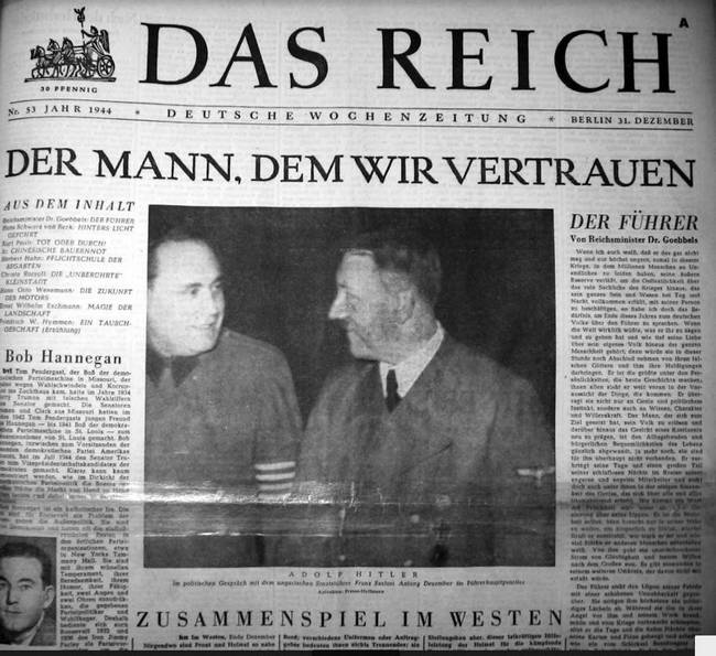 Другой важной газетой, которую Геббельс редактировал и для которой писал редакционные статьи, была еженедельная газета Das Reich, впервые увидевшая свет в мае 1940 года. По мнению Норберта Фрея и Йоханнеса Шмитца, Das Reich была лучшим творением нацистской журналистики. Она предоставляла читателям статьи на политические и экономические темы, репортажи с фронта, а также литературные и культурные обзоры. Геббельс не отказался от культурного раздела газеты, который на протяжении всей войны продолжал публиковать стихи, рассказы и литературные обзоры.[177] Например, 8 октября 1944 года в газете была опубликована статья, посвященная 100-летию со дня рождения философа Фридриха Ницше. В статье говорилось, что одной из главных целей Ницше было просвещение немцев относительно великой идеологической войны, которая произойдет в двадцатом веке.[178] Даже на последнем этапе войны газета Das Reich была золотым дном информации по многим вопросам.
