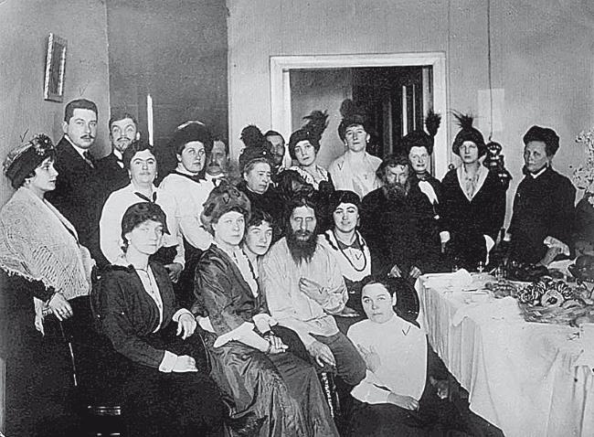 Распутин со своими почитателями (Английский пр., д. 3, кв. 10). Начало 1914 г. В первом ряду – супруги Пистолькорс («Сана» – сестра А. Вырубовой и Александр), Л. Молчанов, Н. Жевахов, Э. Гиль, Н. Яхимович, О. и Н. Ломан, А. Решетникова. Во втором ряду – С. Волынская, А. Вырубова, А. Гущина, Ю. Ден, Е. Распутин (отец Григория). В третьем ряду – 3. Тимофеева, М. Головина («Муня»), М. Гиль, Г. Распутин, О. Клейст. У ног Распутина – А. Лаптинская. Об одном из таких «распутинских вечеров» вспоминал Н. Жевахов: «Какая благоговейная тишина была вокруг, хотя ничего нового он не говорил. Но некая нервная сила, которая от него исходила, гипнотизировала…»