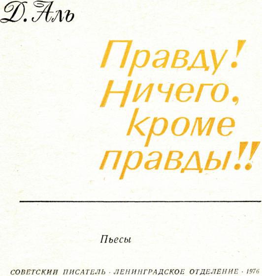 В пьесе «Правду! Ничего, кроме правды!!» мера документальности выше. Ведущий от лица автора заявляет читателям и зрителям: «Прошу вас все время помнить: все участники процесса – сенаторы и свидетели – говорят только подлинным языком стенограмм. Языком исторических документов говорят и другие персонажи, появляющиеся в спектакле. Поэтому я не буду говорить вам: «Документ номер такой-то», ибо документ – все!» И это совершенно точно. Но ведь это только одна сторона дела. Есть и другая.