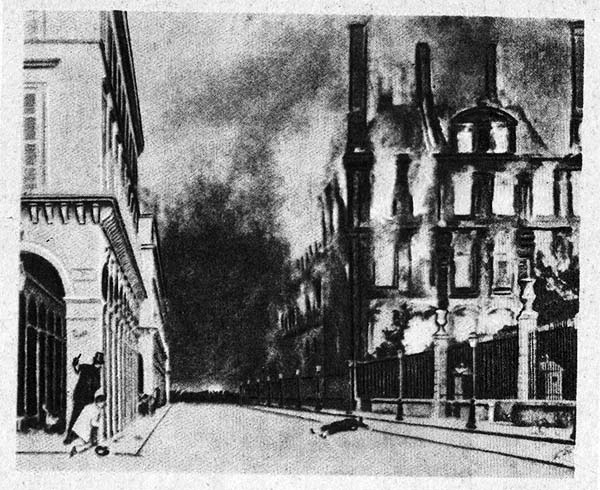 Десятки кварталов Парижа были объяты пожарами. Весь левый берег Сены, начиная от дворца Почетного Легиона до дворца Юстиции и полицейской префектуры, пылал.